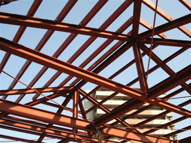大屋根・1F屋根共に寄棟になっている鉄骨2F建てです。母屋や母屋受け梁が気持ちよく納まりました。