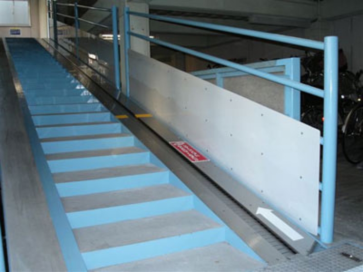 1階から3階までの駐輪場に中央に階段、右側に上り用ベルトコンベア、左側に下り用スロープのある階段です。緩い勾配になっている為、1階分が12m程あります。
