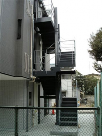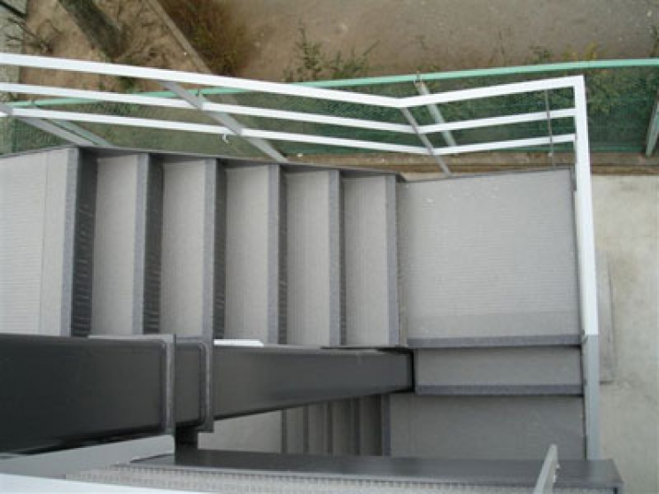 折返し部に2つの踊場間に1段設けた3段廻りタイプになっており、鉄板の上に専用のシートが貼られています。