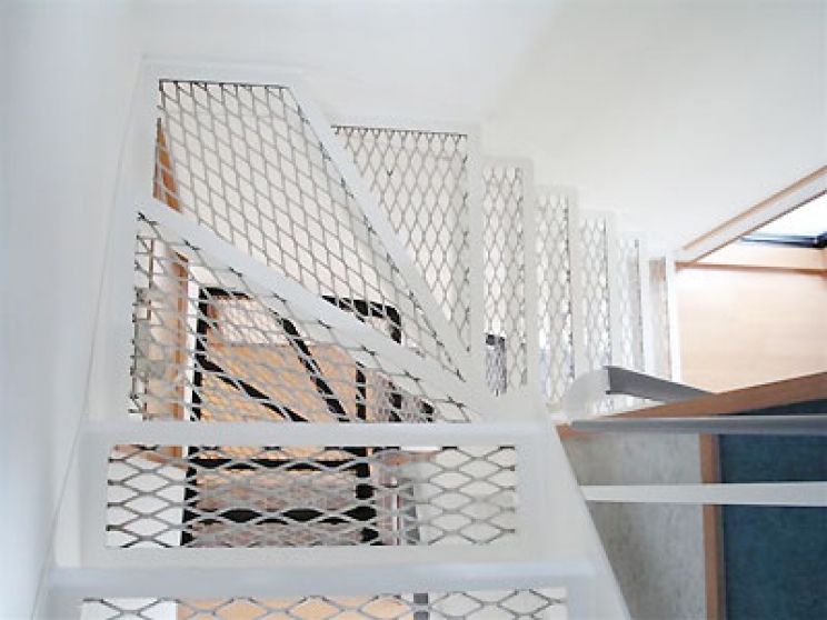室内階段ですが、施主様の御希望で踏板部にエキスパンドメタルを使用しました。各階で色分けをされております。