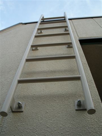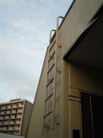 屋上の点検用タラップです。ボルトをALC壁に貫通させて裏側をフラットバーで補強してあります。
