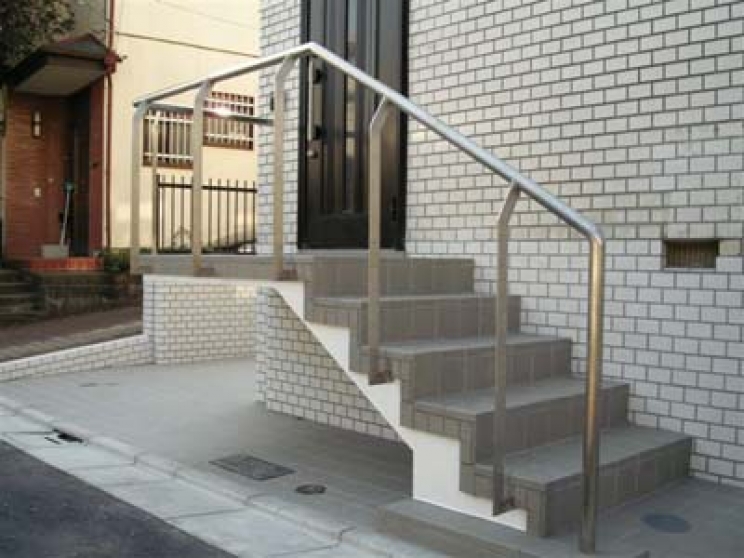 個人住宅エントランス部のステンレス製手摺です。ヘアーライン仕上げでフラットバー支柱が外側に屈曲しています。