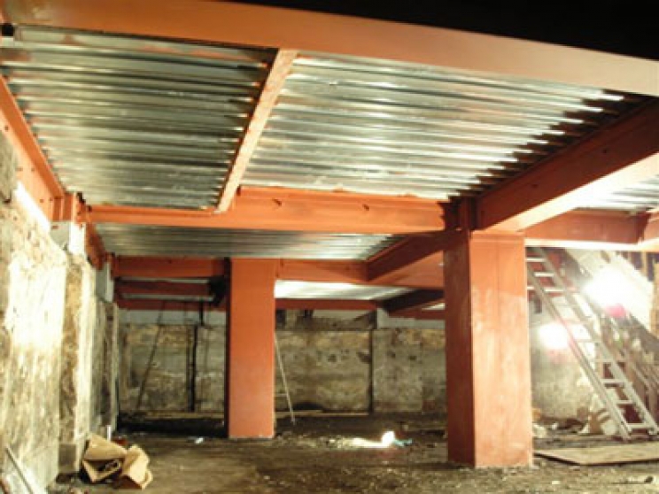 大正時代のビルの地下を柱・梁・壁には鉄板で、天井はデッキプレートで補強しました。1パーツが200kg以上あったので搬入・取付が大変でした。
