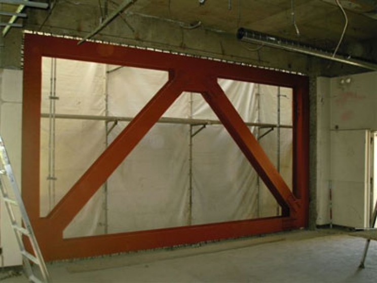 消防署内の壁に鉄骨ブレースを取付けて建物の耐震性を向上させます。