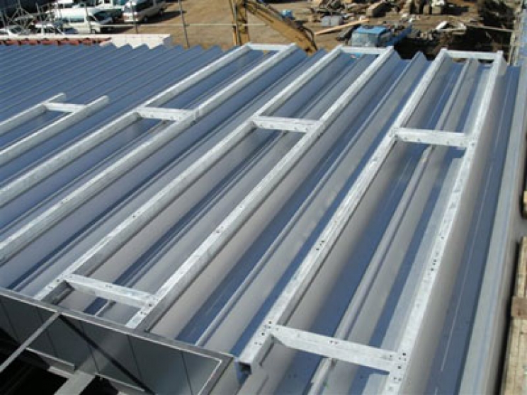 折板屋根の上に空調の室外機置場を溶融亜鉛メッキにて施工しました。
