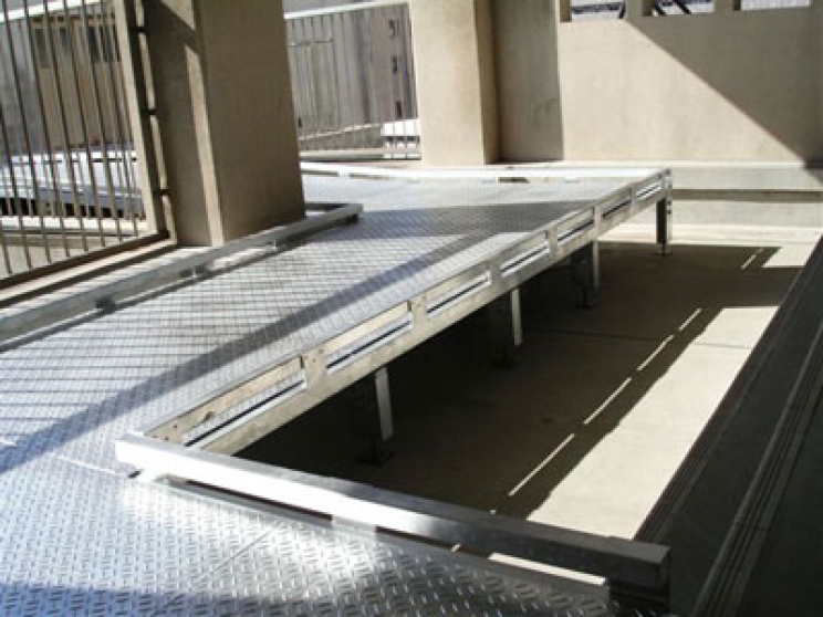 校舎間の屋上を車椅子で通行できるように、微妙な勾配をつけて亜鉛メッキした架橋を取付けました。