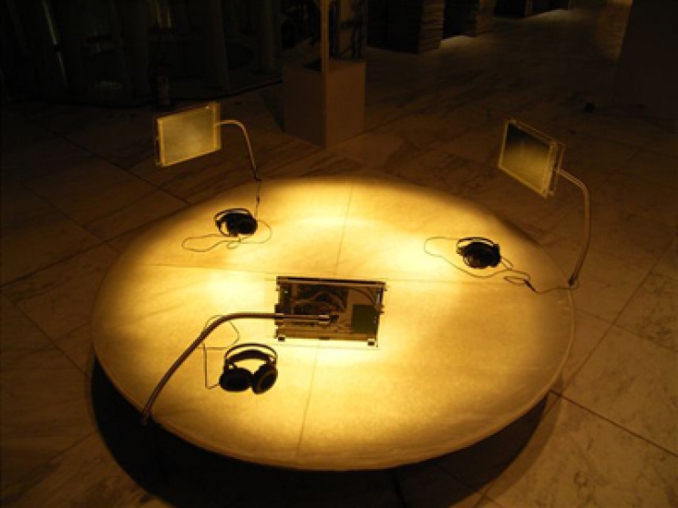 音楽や映像を楽しむ為の半球体のソファー?です。器となる半球体とモニターの取付ステイを
