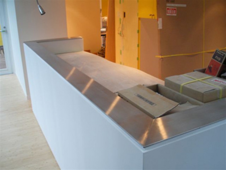 6mmのステンレス板を角を面取りしてあるキッチンカウンターと、周囲に折り返し処理をしてある洗濯機を置く為のステンレス製パンです。双方ともヘアーライン仕上になっています。
