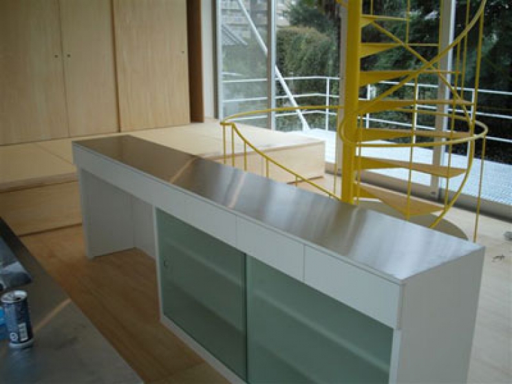 キッチンの調理台にステンレスヘアーライン仕上げの板を貼り付けました。